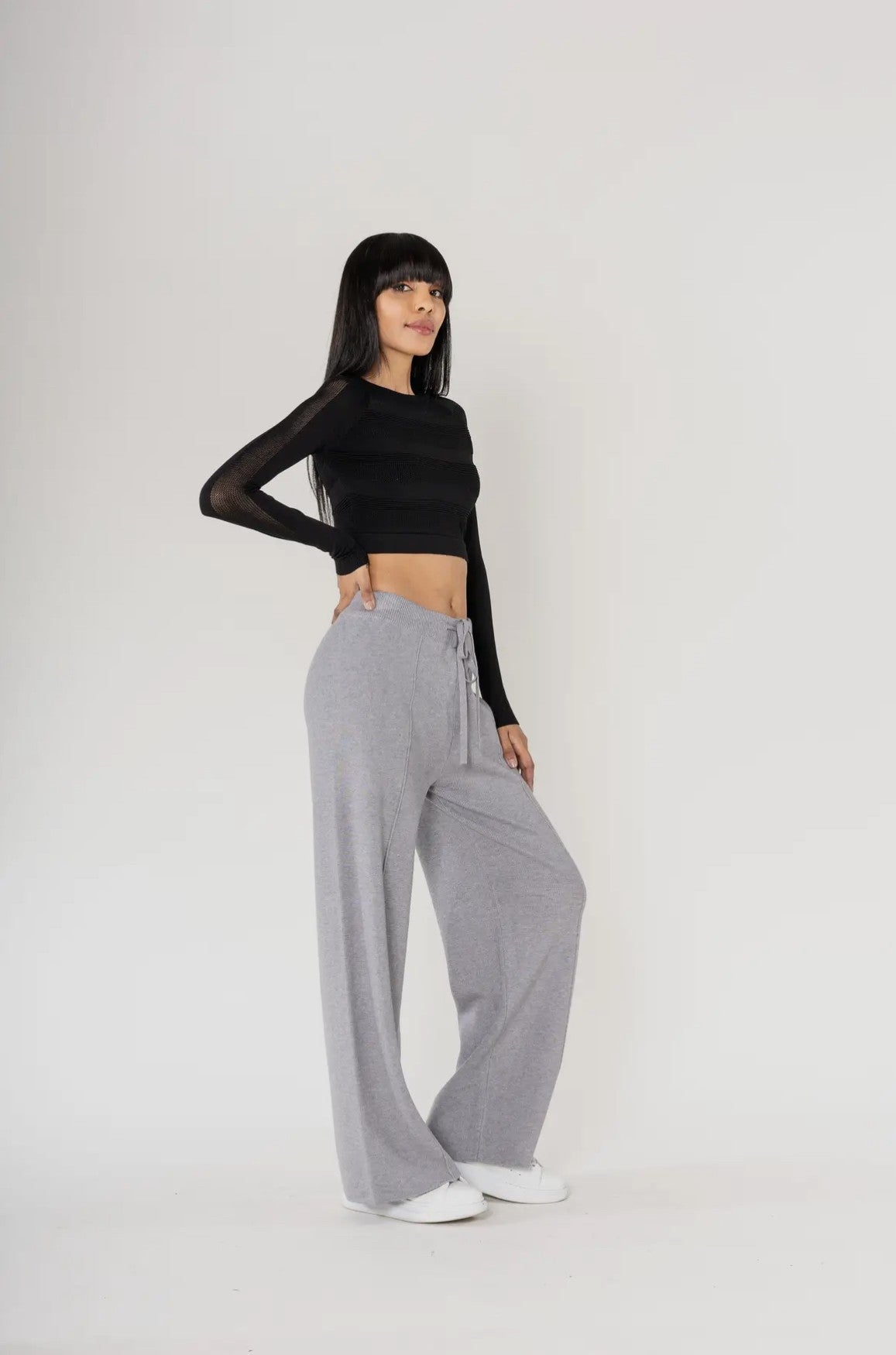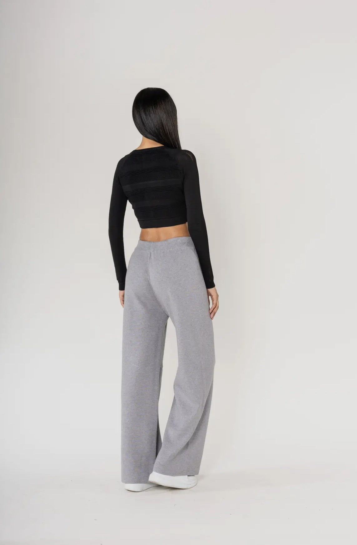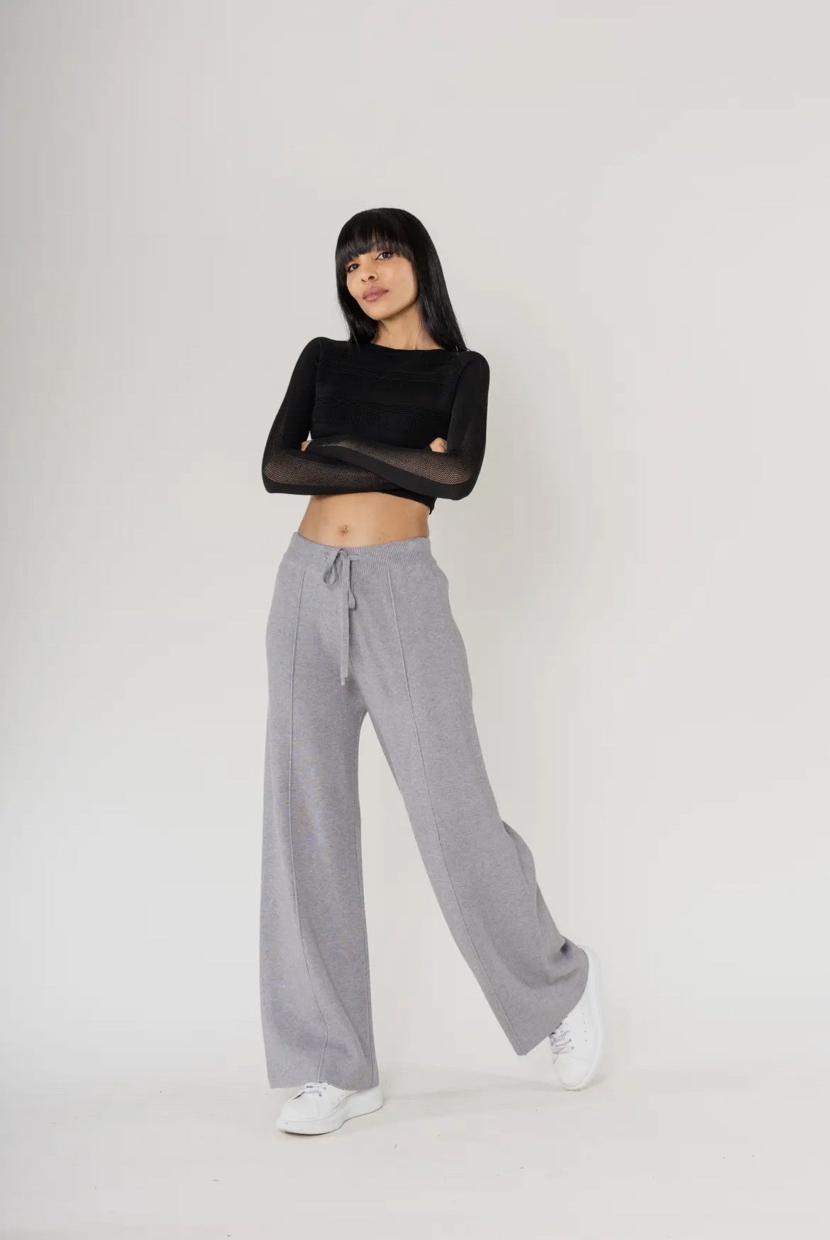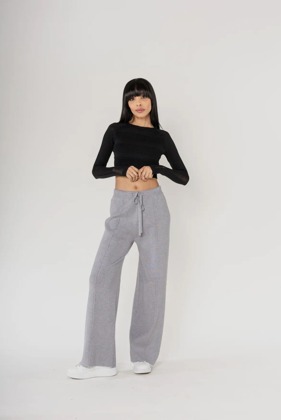 Disse strikbukser kombinerer loungewear og mode i ét. Med deres let svajede ben og justerbare talje giver de et afslappet, men moderne look, perfekt til både hjemmet, hverdagen eller en casual tur i byen.