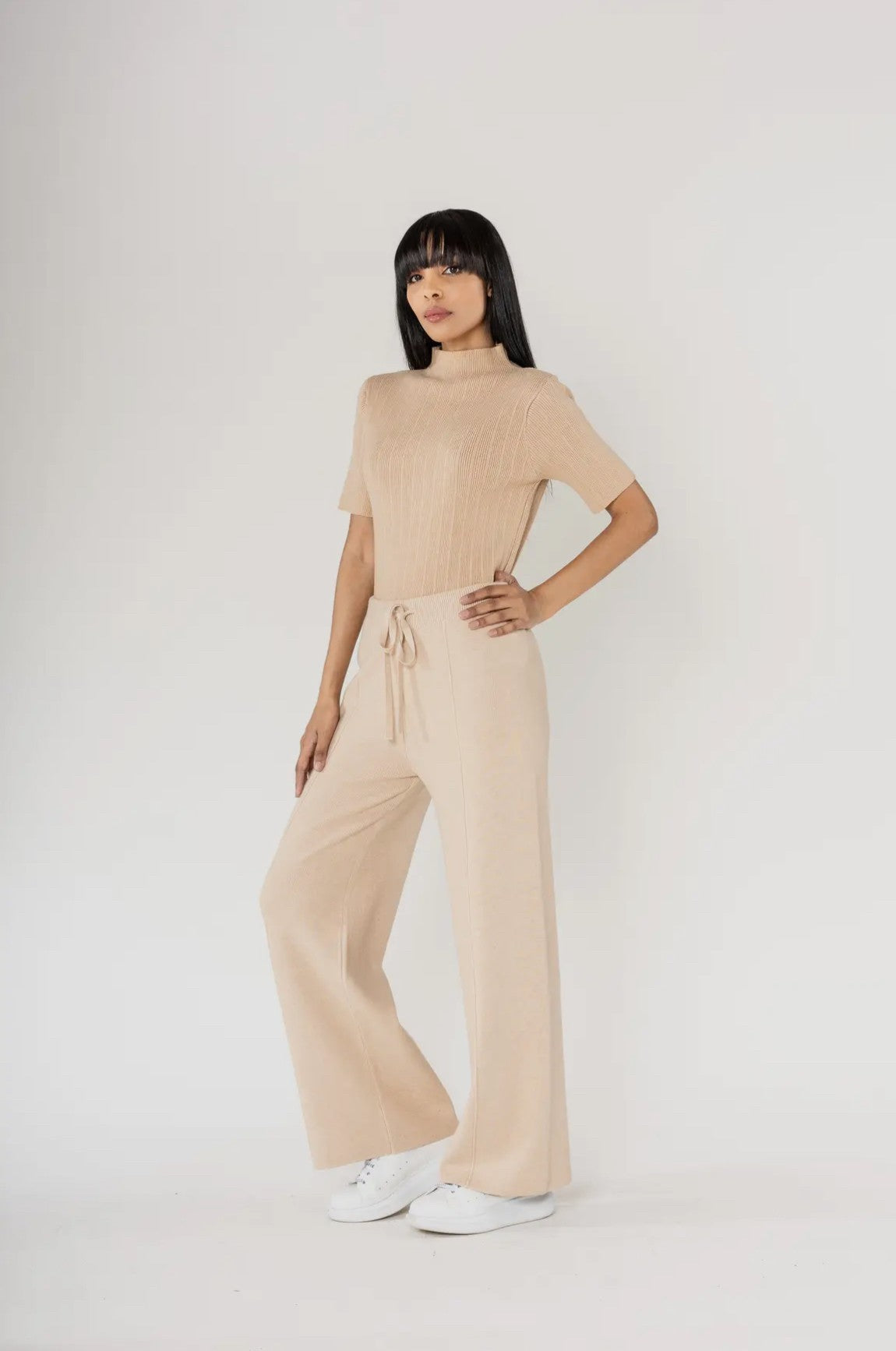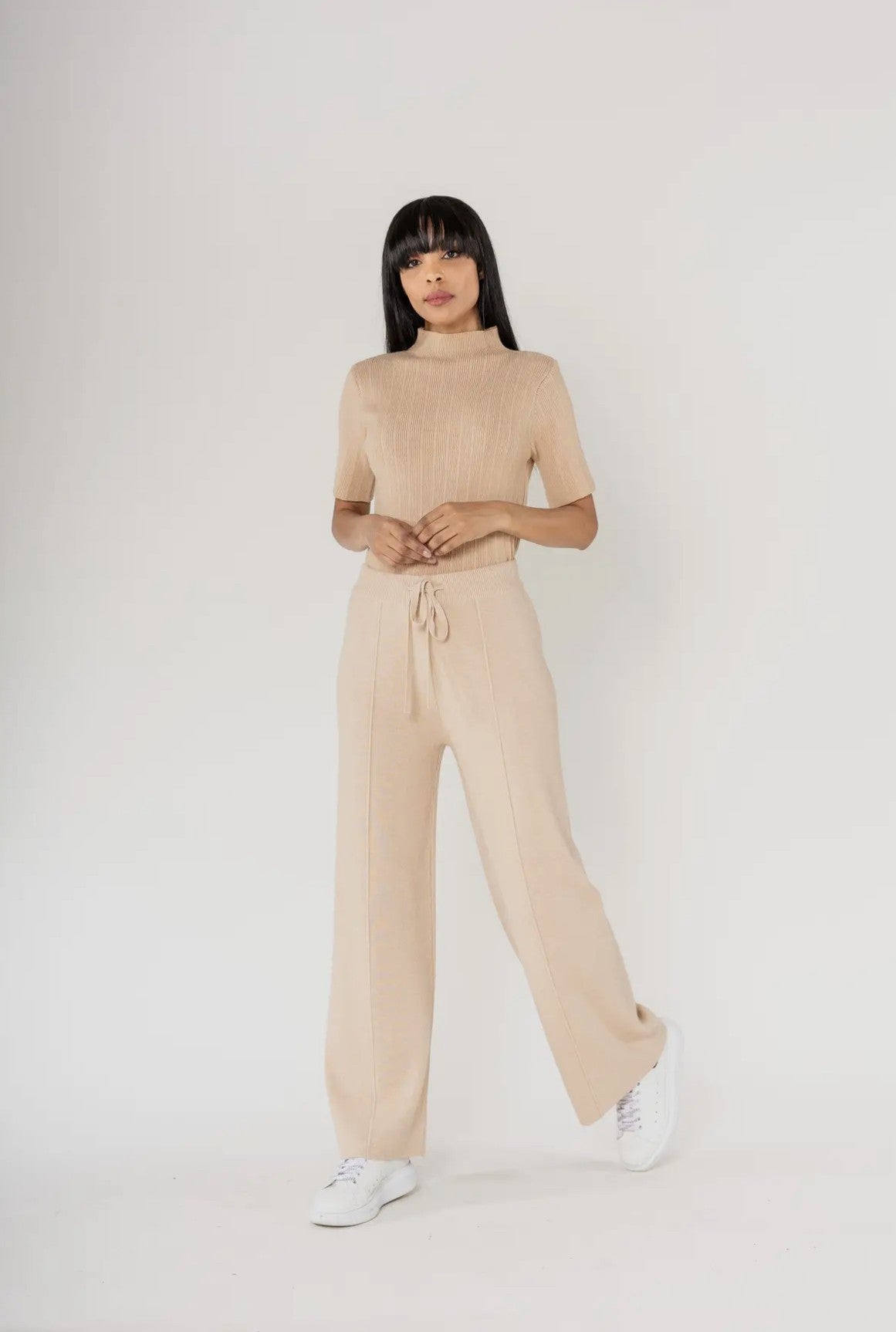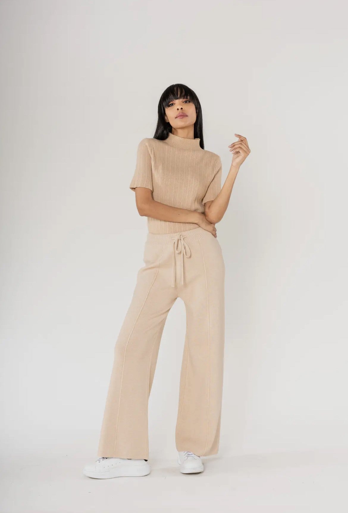 Disse strikbukser kombinerer loungewear og mode i ét. Med deres let svajede ben og justerbare talje giver de et afslappet, men moderne look, perfekt til både hjemmet, hverdagen eller en casual tur i byen.