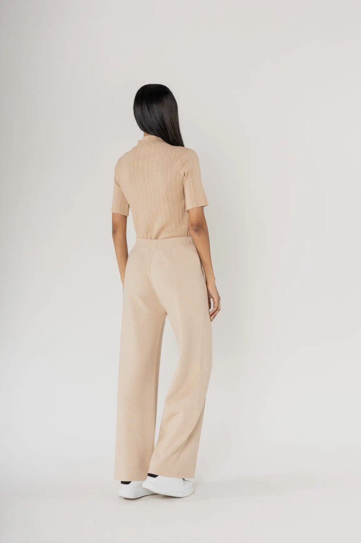 Bukserne er fremstillet i en blød viskoseblanding, der føles behagelig mod huden og holder formen flot. Den neutrale sandfarve gør dem nemme at style med både strik, skjorter og t-shirts – et alsidigt basisstykke til garderoben.