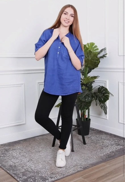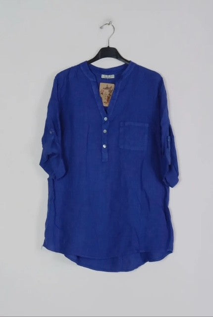Blusen er fremstillet i Italien af ren hør, hvilket gør den åndbar og behagelig at have på – både til hverdagsbrug og ferielook.