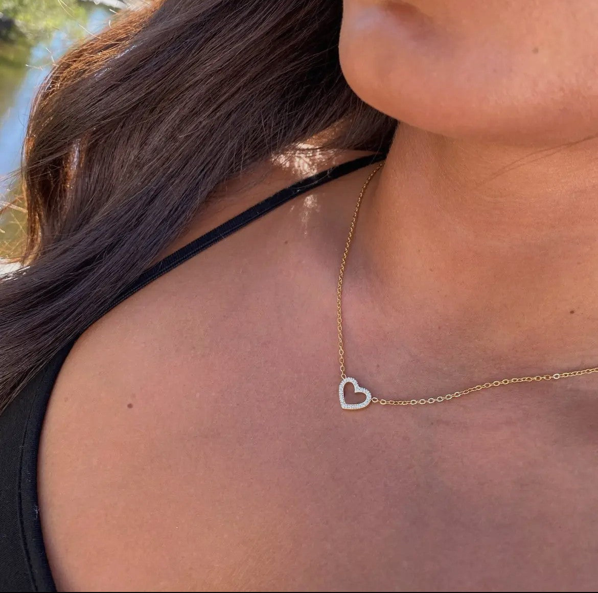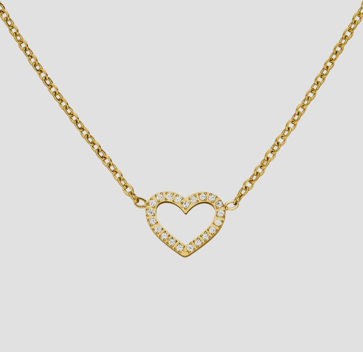 Romantisk Shine Heart halskæde. Hjertet er elegant besat med funklende facetslebne zirkonia-sten, som giver et klassisk og feminint udtryk. Halskæden er fremstillet i kirurgisk stål med 18 karat guldbelægning, hvilket gør den både holdbar, vandtæt og nikkelfri.