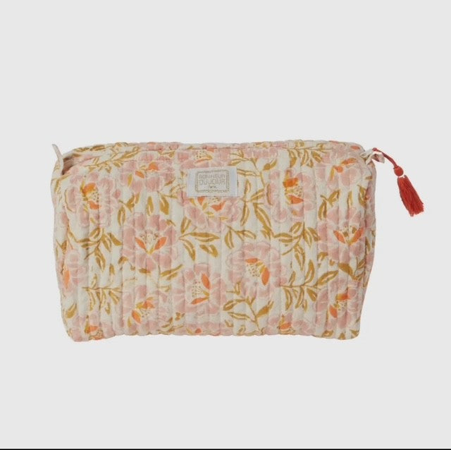 Elegant blomsterprintet toilettaske. Petunia Rose er designet med et romantisk mønster i rosa og gyldne toner, quiltede syninger og en håndlavet kvast som fin detalje.